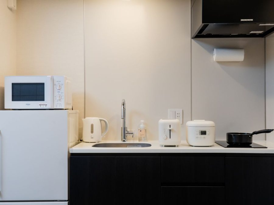 IH stove / tableware / cutlery / refrigerator / microwave / electric kettle / dish detergent / dish sponge / pot / saucepan / frying pan / bowl / strainer / knife / cutting board / cooking chopsticks / ladle / spatula / kitchen scissors / paper towels / coffee / tea