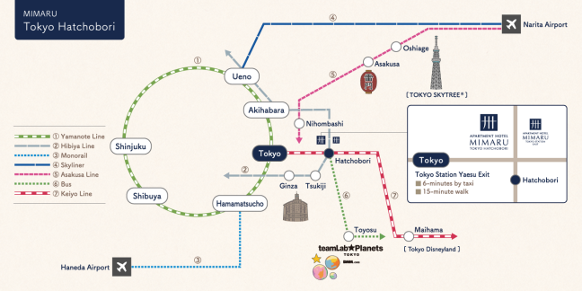 Located in central Tokyo Direct access to Tsukiji, Akihabara, Shibuya and Maihama station.