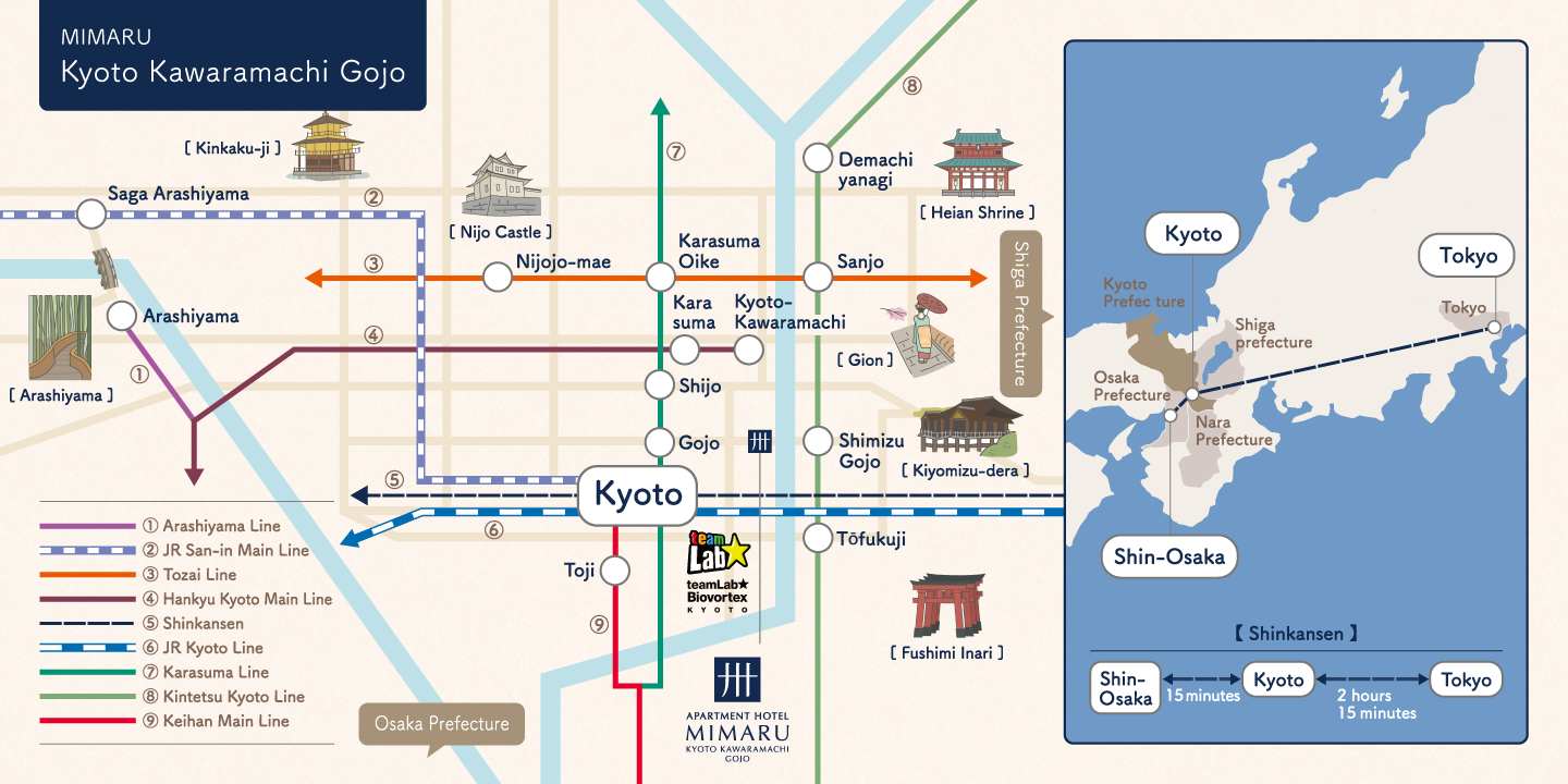 Kawaramachi Gojo is located near the Kamo River where you can enjoy nature in the heart of Kyoto, Kiyomizudera, and the Higashiyama Area. Expand your trip to Kyoto even more with trips to Osaka and Lake Biwa!