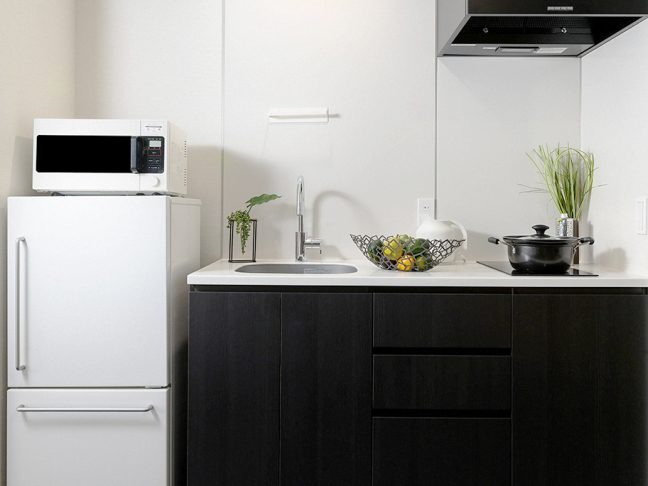 IH stove / tableware / cutlery / refrigerator / microwave / electric kettle / dish detergent / dish sponge / pot / saucepan / frying pan / bowl / strainer / knife / cutting board / cooking chopsticks / ladle / spatula / kitchen scissors / paper towels / coffee / tea