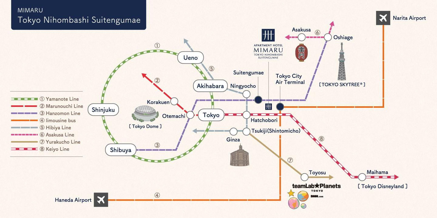 Only a 4-minute walk to Tokyo City Air Terminal (T-CAT) which features direct buses to major airports. Head to Tokyo Skytree® or Shibuya straight from Suitengumae Station.