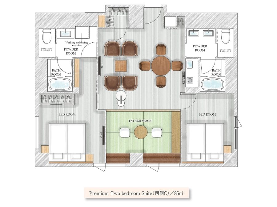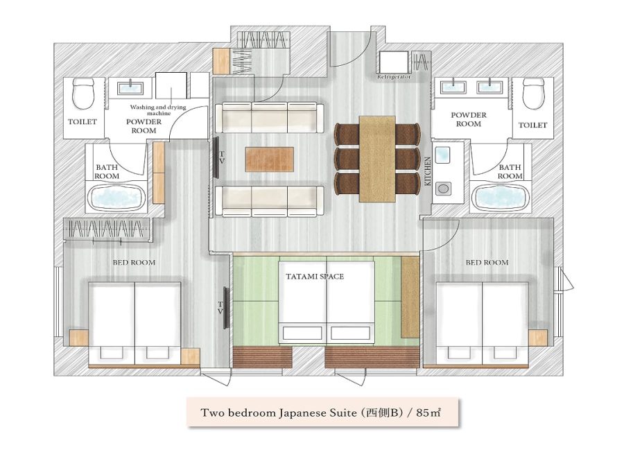 Located just a 3-minute walk from Karasuma Oike Station, allowing easy movement in any direction within Kyoto City. All rooms offer two separate bedrooms in a spacious 85㎡ apartment.