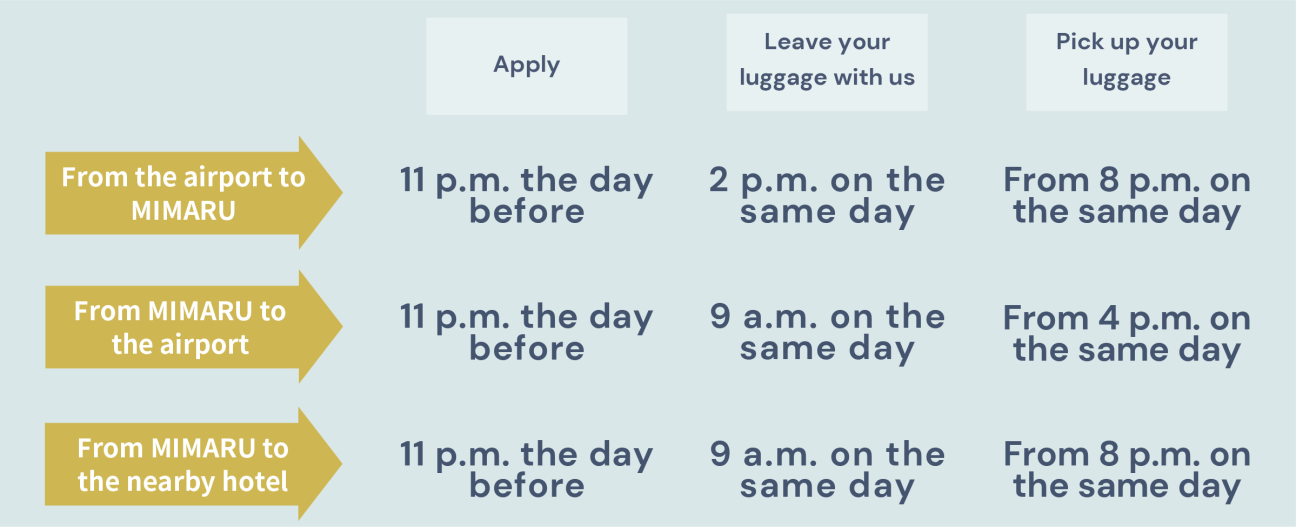We will take care of your luggage the moment you arrive at the airport in Japan and deliver it to your MIMARU.With our service, your Japan trip starts the moment you arrive at the airport.