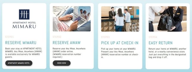 “Any Wear, Anywhere” was launched by Sumitomo Corporation in July 2023. Travelers staying at MIMARU can reserve clothing sets online in advance, selecting options according to season and travel purpose, receive them at their place of stay, and return them within Japan after use. By reducing clothing transportation and