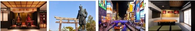 ● Osaka Castle: Built by Toyotomi Hideyoshi as a base of operations for unifying the country. The castle tower, the third one built during the Toyotomi and Tokugawa eras, was reconstructed using donations from citizens and offers a panoramic view of Osaka. Visitors can also take a boat around the inner castle moat and dine nearby while enjoying the view of Osaka Castle.