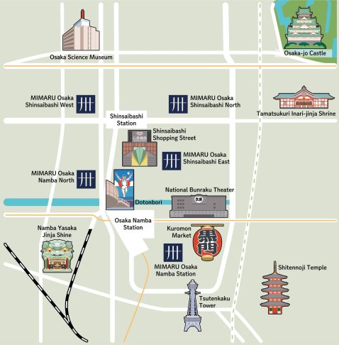 It takes about 1 hour by direct flight from Kansai Airport to any of the five MIMARU properties in Osaka.