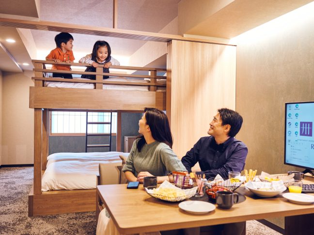 Family type room with king bunk bed (capacity of 4 people) 24 rooms, Japanese type apartment with Japanese style room (capacity of 4 people) 24 rooms, Suite type room with two independent bedrooms (capacity of 6 people) 32 rooms.