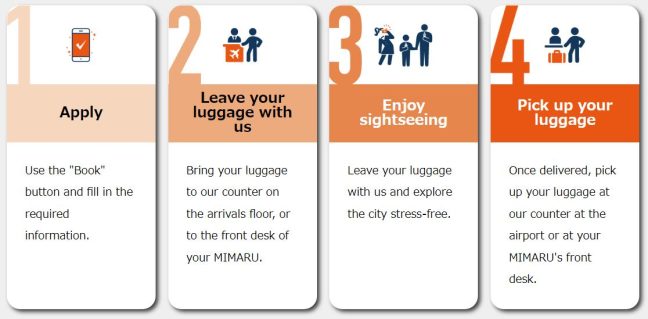 To apply, simply enter the necessary information on the KURO-GO Luggage Delivery service website (available languages: Japanese/English/Chinese). Upon arrival in Japan, your luggage will be checked in at the airport and delivered to the MIMARU where you will be staying. You can then send your luggage from MIMARU to the airport when it’s time to return home. Freely explore and travel from the airport to sightseeing spots and from sightseeing spots to the airport without worrying about luggage.