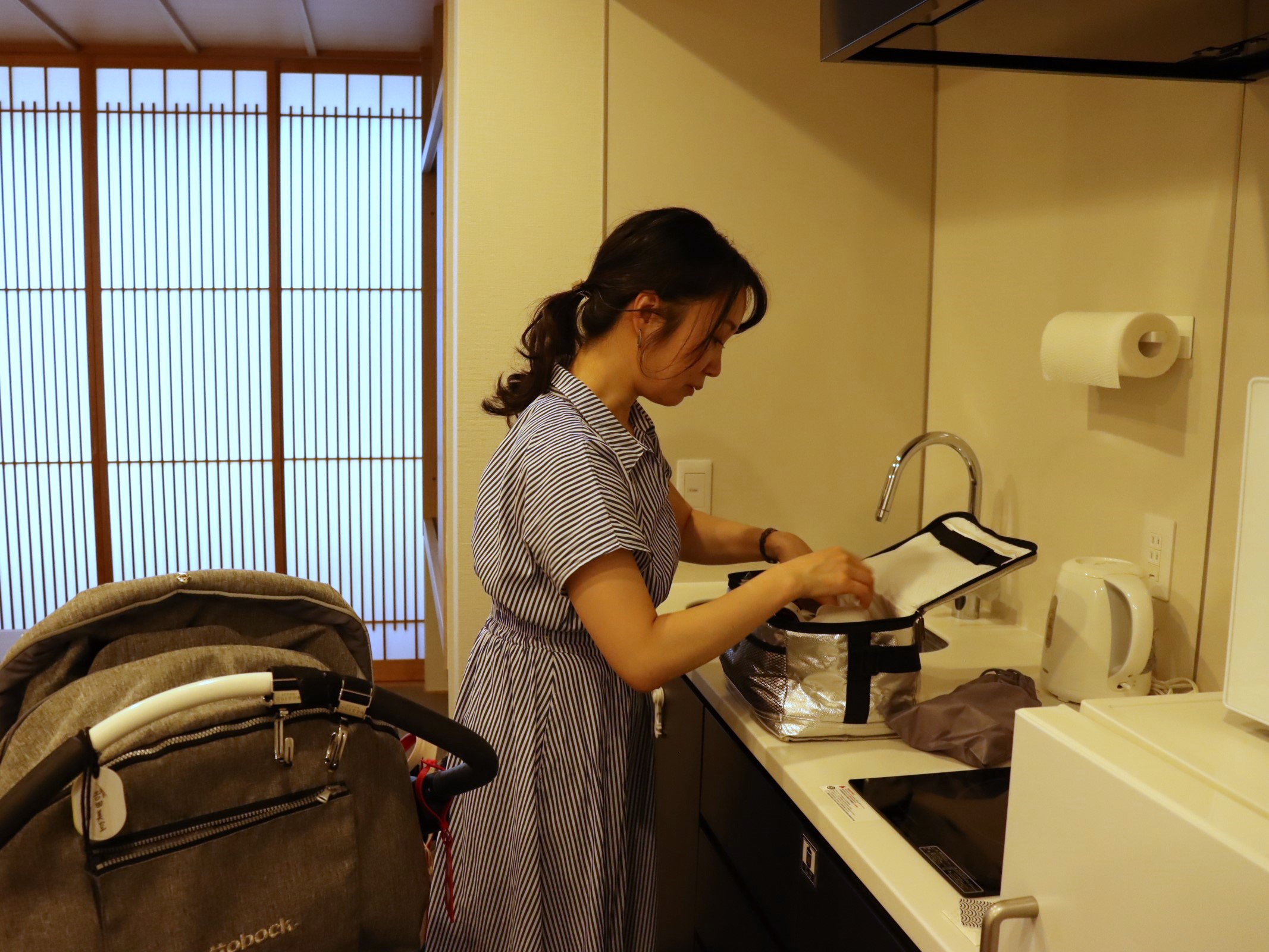 MIMARU’s guest rooms are known for their spacious design, making it possible to move around even with a large buggy used by a junior high school student. The in-room kitchen and washing machine also seemed to be a reassuring feature for the families .