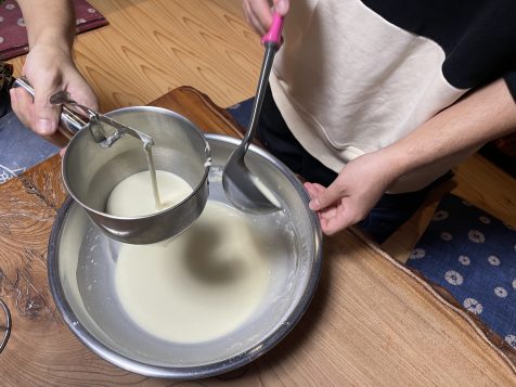 Sift in the flour, mix the batter carefully to avoid bubbles, and transfer it to a “chakkiri,” a tool used to pour batter into molds.