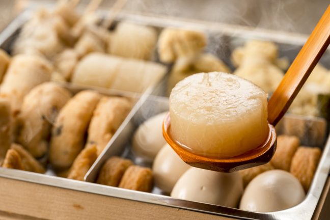 ●Oden: Oden is a type of hot pot where veggies such as daikon radishes, various fish cakes, meats such as beef tendon, and many other items are cooked in a dashi broth. Oden is so popular that it is available at convenience stores for about A$1 per item, making it an affordable and tasty choice.