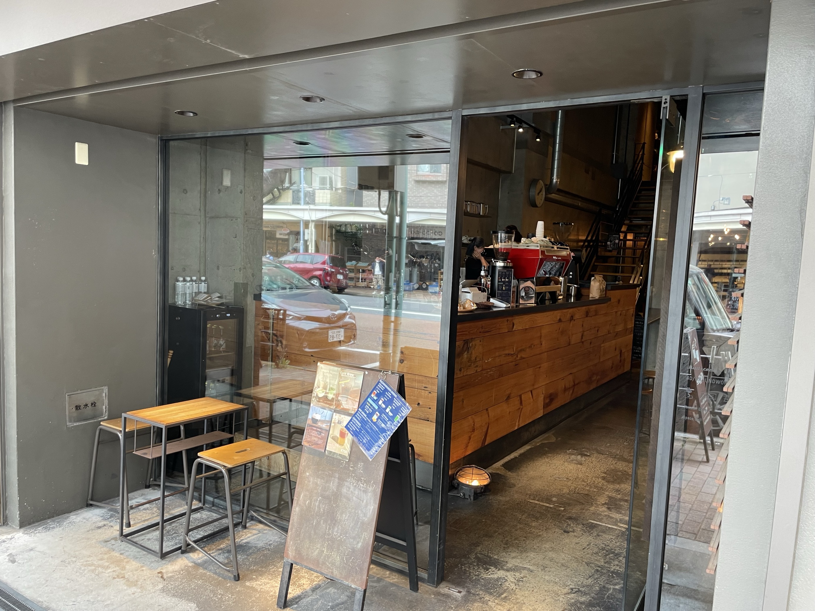昼の14時ごろに行くと、半分以上埋まっていました。2階があるため、カフェの半分は吹き抜けになっていて開放感があり、とても広く感じます。オープンな空間になっているので声が響きますが、非常に大きなスピーカーからレコードの音楽も流れており、賑わっている印象を受けました。壁と天井は灰色のコンクリートのみで、ライトは少なめだったので、少し暗いように感じましたが、昼間は外の光が入ってきて落ち着いた良い雰囲気でした。メニューも英語と日本語がどちらも記載されていました。