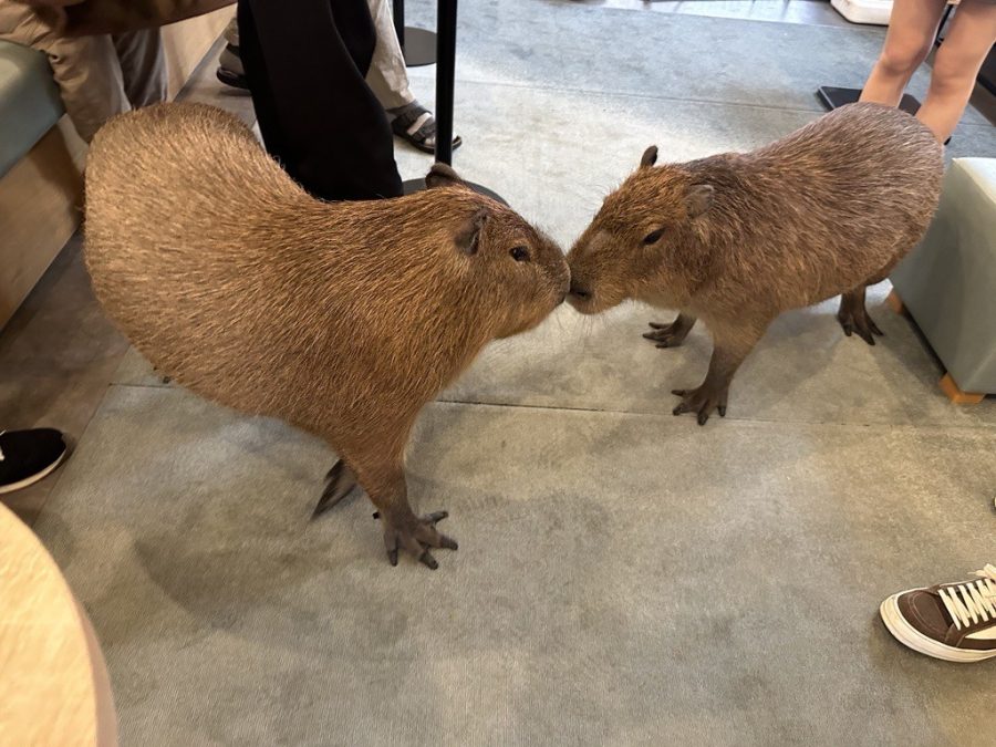 ここは、6歳以上のお子様が、かわいくて人懐っこい2匹のカピバラを撫でたり、おやつをあげたり、一緒に写真を撮ったりして楽しめるカフェです。到着すると待合室で待って、カピバラに会う前に説明を読むように言われます。また、荷物を安全に保管し、店内を自由に手ぶらで歩けるロッカーもあります。予約すると、ドリンク1杯が料金に含まれますが、もっと飲みたい方は、その場で買うことができます。カピバラがあなたの周りに来てくれるように、ペレットでも野菜でも、おやつを買うことができます。カピバラと一緒に時間を過ごすと、ストレスを忘れて心から楽しむことができます。