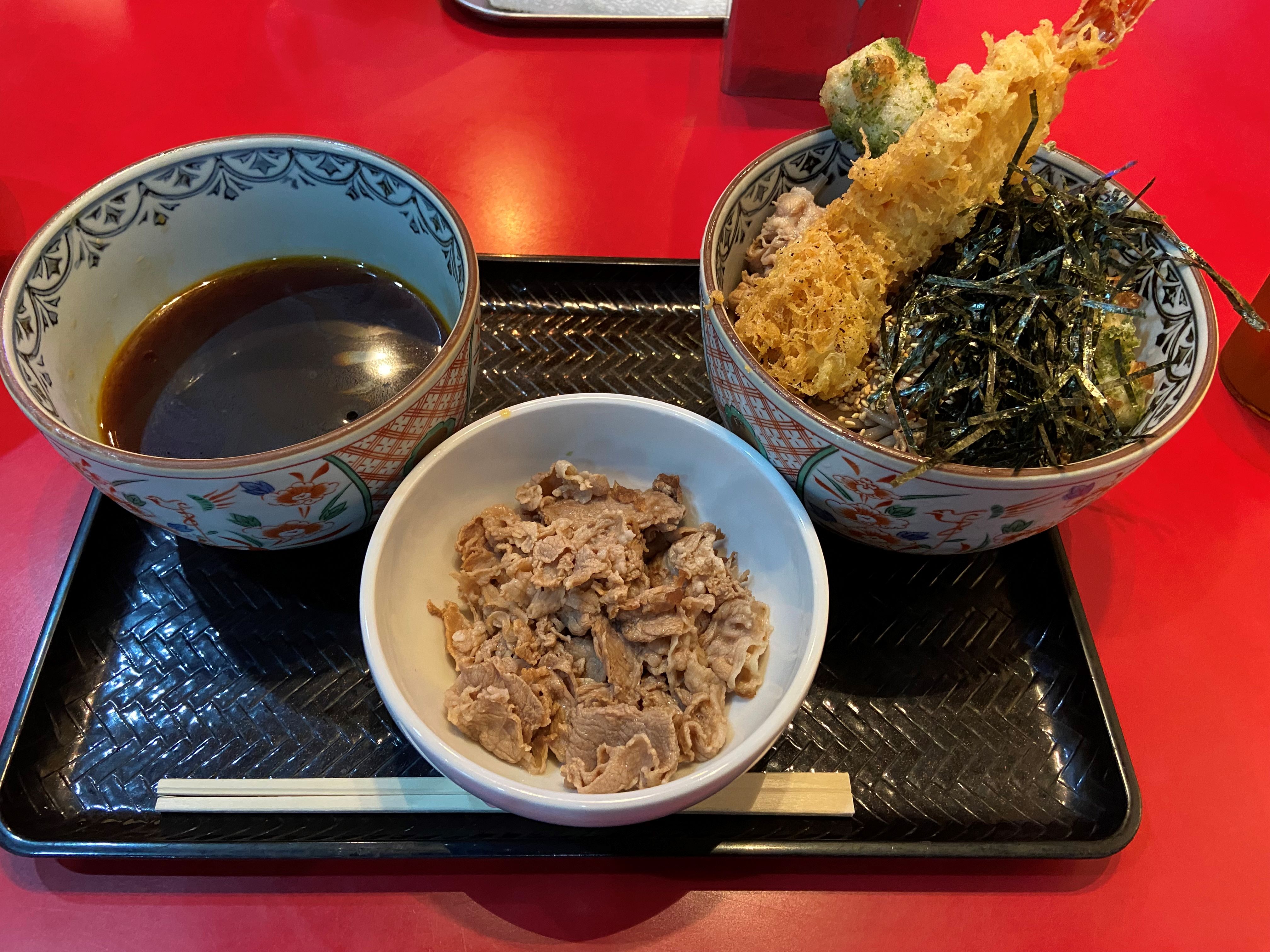 お店はあまり大きくないですが、4~5人で座れるテーブルが1つあるので、小グループだったら一緒に食事ができます。最初に食券を買うスタイルですが、英語表記が無いので写真を見て店員さんに聞くのがマスト!蕎麦麺は太くて固めなので、食べ応えがあります。つけ汁も濃いめで、つけ麵と蕎麦のミックスのような料理です。変わった料理が食べたい方におススメです!