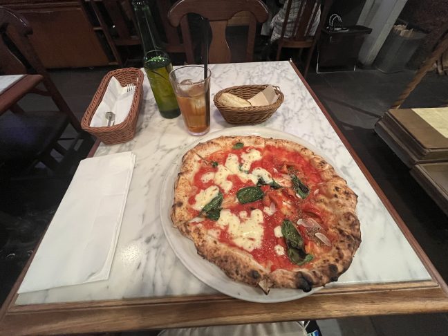 駅のすぐ近くにある人気店舗で、かなり本格的なピザー屋さんでした。スタッフはめっちゃ笑顔で接してくれるわけではないが、気遣いが抜群です。ピザーはハーフ&ハーフで2種類のものを選べます。生地が厚すぎないので、食べやすかったです。さらに、おまけでバター焼きのパンをもらいました。お店の雰囲気と食べ物の味からすれば、かなりコスパがよかったです。持ち帰りもできますので、便利です。