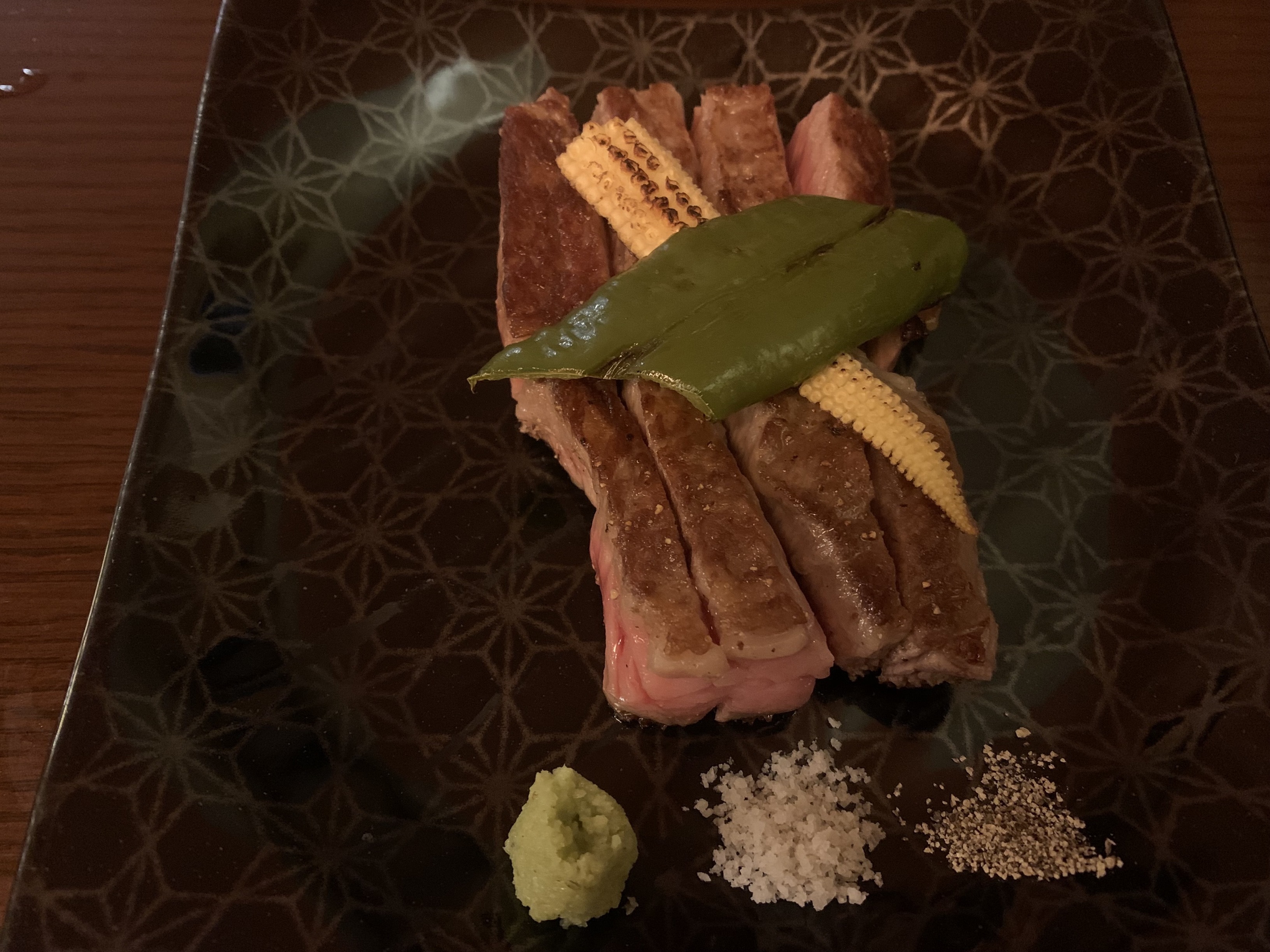 レストランは観光客に人気な先斗町にあり、看板は小さいですが意外に見つけやすいです。店内は落ち着いている雰囲気で、カウンター席とテーブル席とも用意されています。キッチンは半開放式なのでシェフが料理を振舞っているところが見られます。スタッフは居酒屋のように明るい感じではありませんが簡単な英語もでき丁寧に接客されています。お料理一品から一品の待ち時間は短いですがせかされる感じもなく無事に完食できました。目玉の黒毛和牛サーロインステーキは100gで女性にはちょうどよかったのですが男性には少し物足りない気がするかもしれません。単品であわびやフォアグラなども注文できますのでおすすめです。