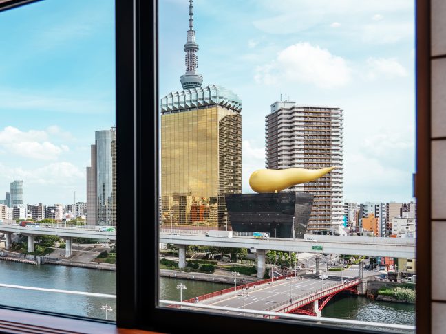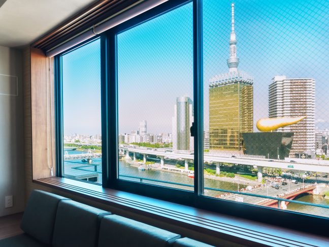 お部屋の窓から目の前に広がる隅田川を一望できる特別なお部屋。子どもも喜ぶ2段ベッド付き。