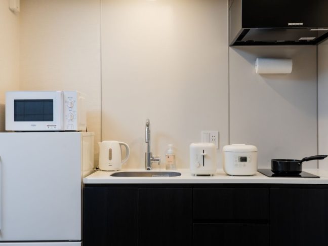 IHコンロ/食器/カトラリー/冷蔵庫/電子レンジ/電子ケトル/食器用洗剤/食器用スポンジ/両手鍋/片手鍋/フライパン/ボウル/ザル/包丁/まな板/菜箸/おたま/フライ返し/キッチンはさみ/キッチンペーパー/コーヒー/お茶