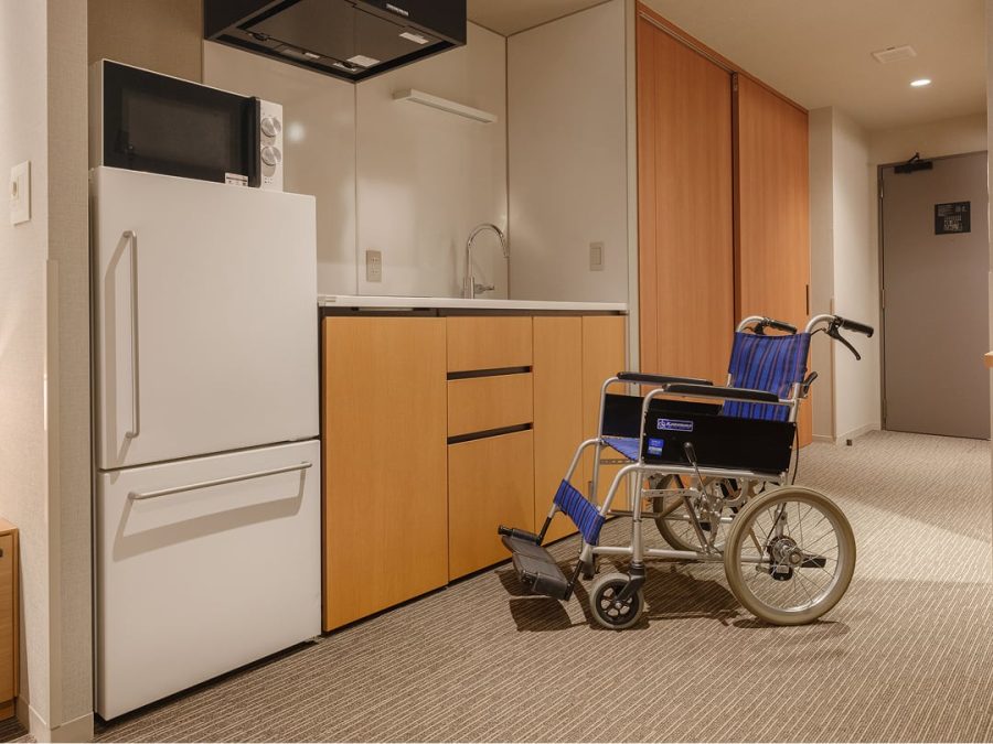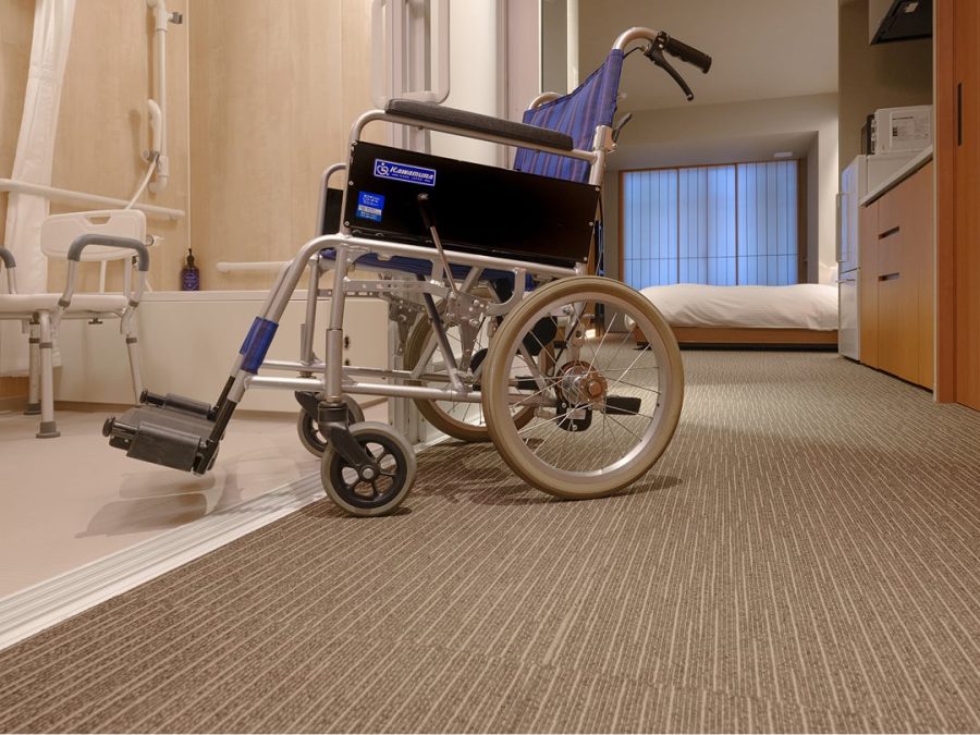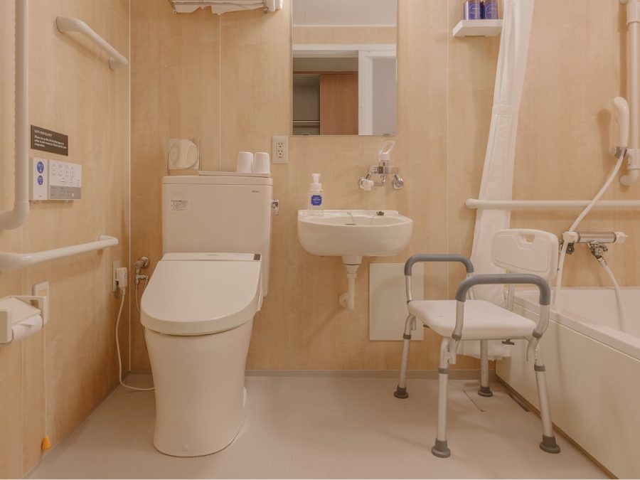 車いすでも安全で快適にお過ごしいただけるよう通路幅を広く、転回スペースも充分に確保。浴室もユニバーサル設計のユニットバスです。