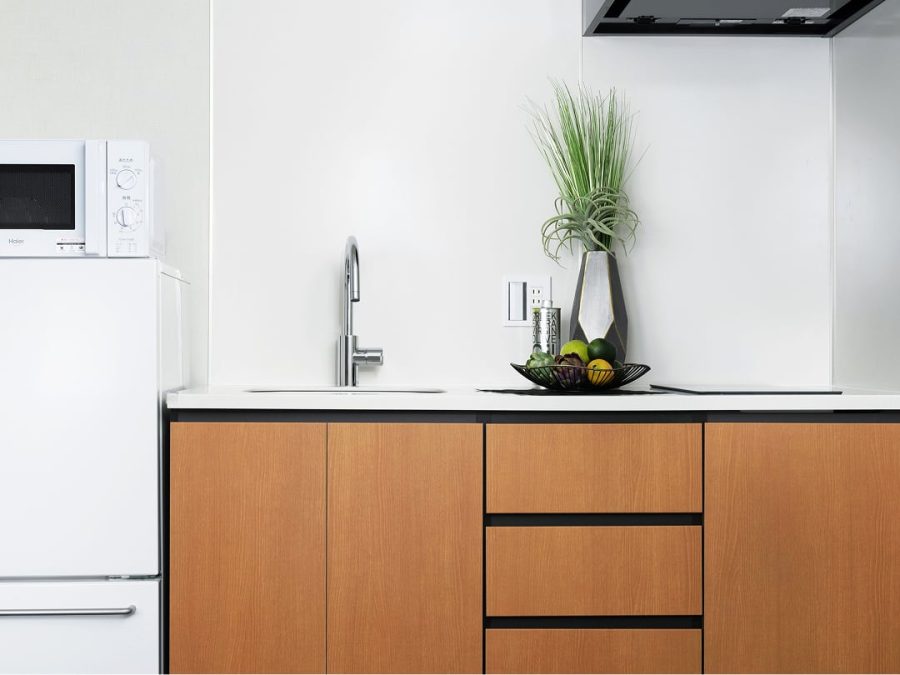 IHコンロ/食器/カトラリー/冷蔵庫/電子レンジ/電子ケトル/食器用洗剤/食器用スポンジ/両手鍋/片手鍋/フライパン/ボウル/ザル/包丁/まな板/菜箸/おたま/フライ返し/キッチンはさみ/キッチンペーパー/コーヒー/お茶