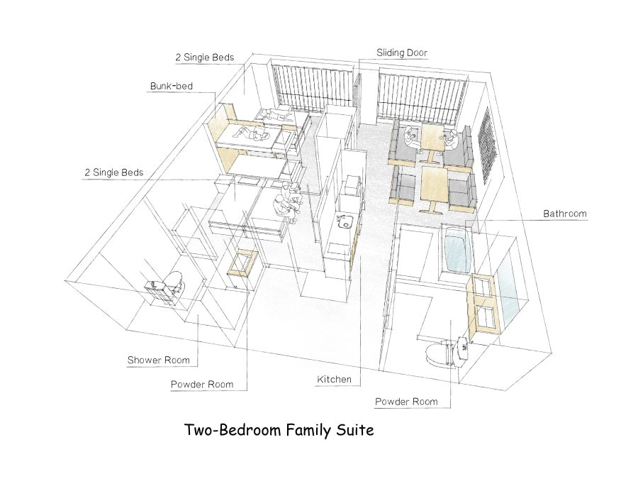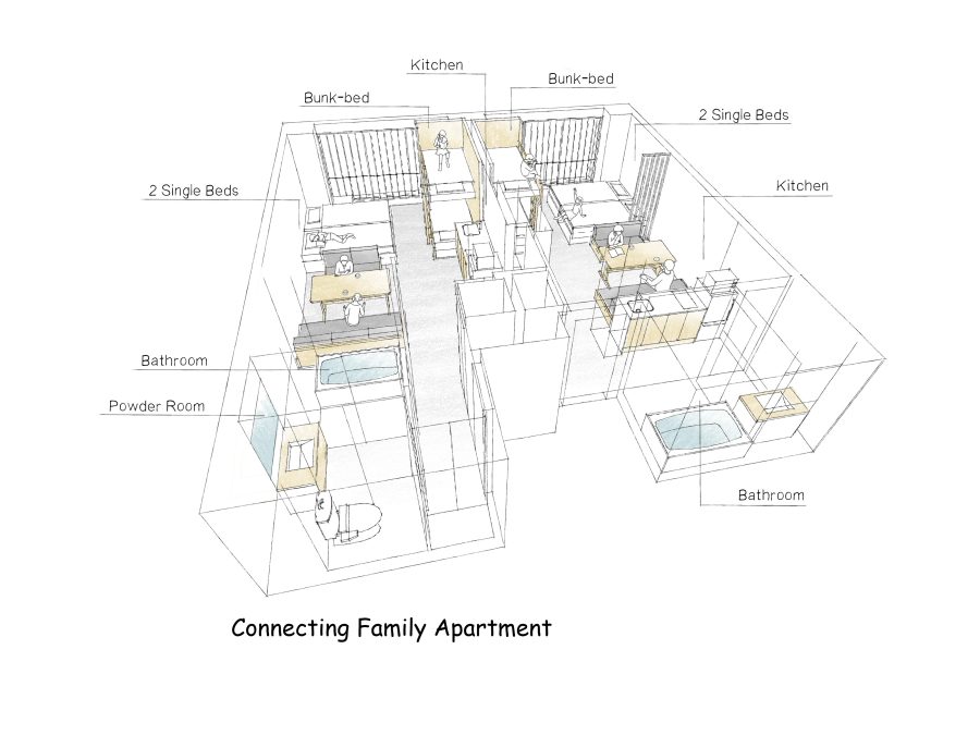 隣り合ったお部屋を内側のドアーつで行き来できるタイプ。一定のプライバシーは確保しつつ、グループで繋がることができます。