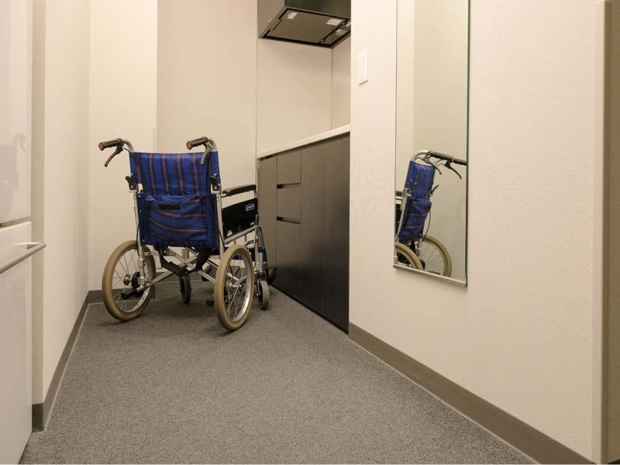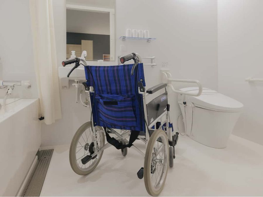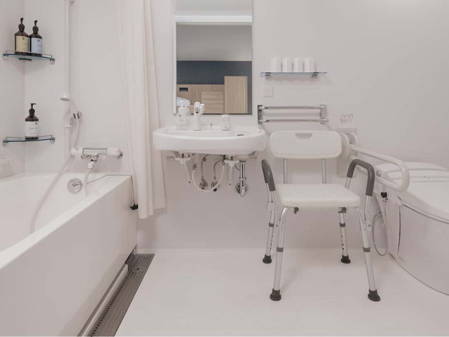 車いすでも安全で快適にお過ごしいただけるよう通路幅を広く、転回スペースも充分に確保。浴室もユニバーサル設計のユニットバスです。