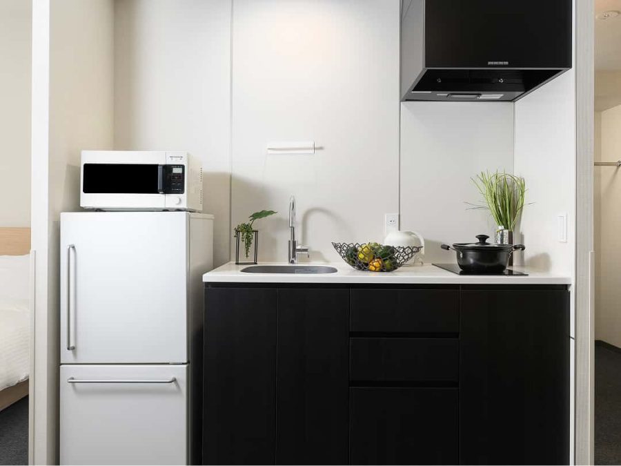 IHコンロ/食器/カトラリー/冷蔵庫/電子レンジ/電子ケトル/食器用洗剤/食器用スポンジ/両手鍋/片手鍋/フライパン/ボウル/ザル/包丁/まな板/菜箸/おたま/フライ返し/キッチンはさみ/キッチンペーパー/コーヒー/お茶