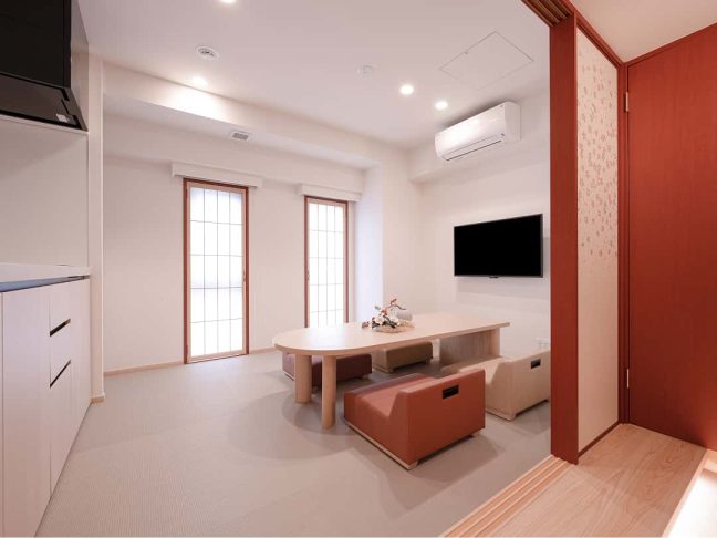 日本らしい桜をデザインした落ち着いた雰囲気の中に、どこか可愛らしさを感じる畳もあるお部屋。