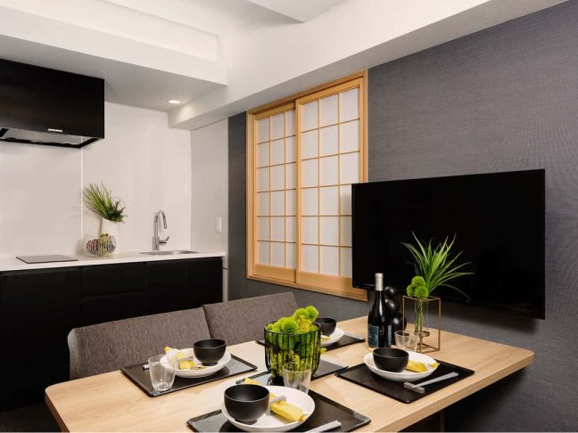 すべてのお部屋にキッチンや調理器具、ダイニングテーブルをご用意。旅先でも、まるで自分の家にいるかのようにくつろいで過ごせます。