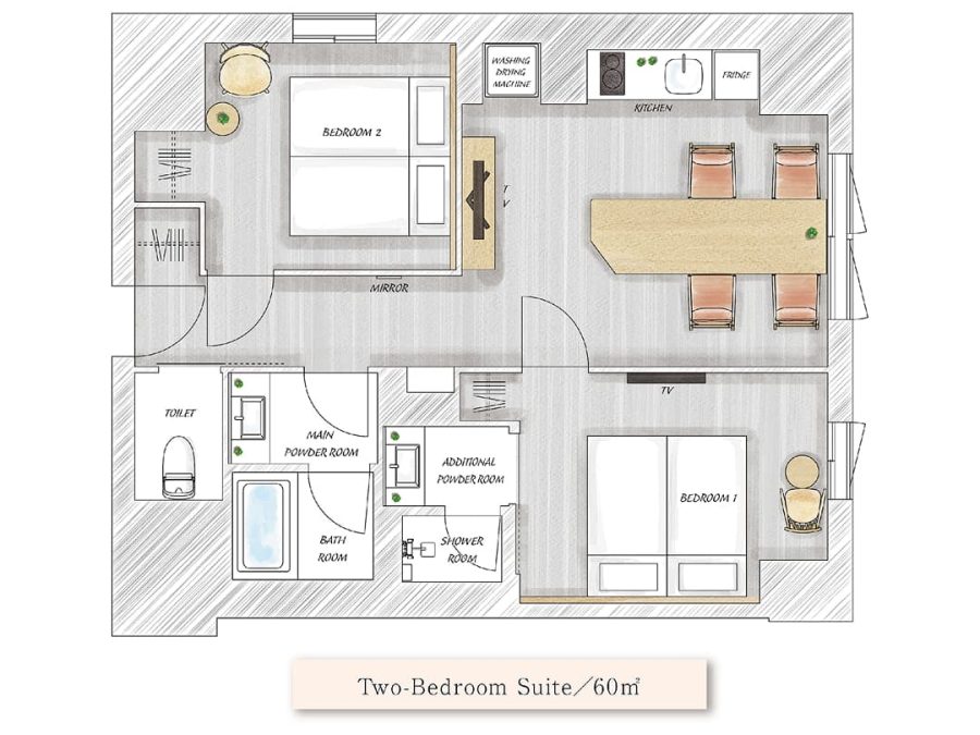 2つのベッドルームを備えたスイートルーム。大きなダイニングテーブルを囲んで、皆でお食事を楽しめます。