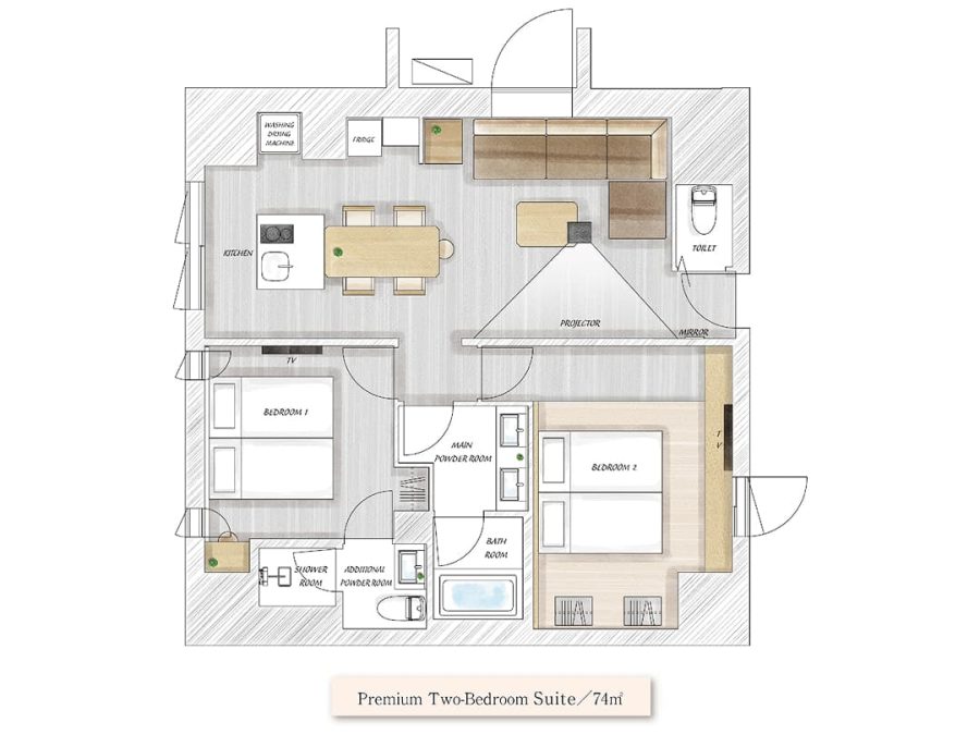 2つのベッドルームを備えたプロジェクター付きのスイートルーム。自分好みの、食事・シアター・音楽を楽しみながら、ゆったりとおくつろぎください。