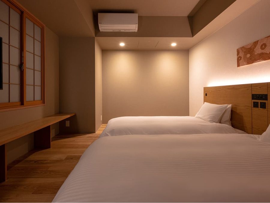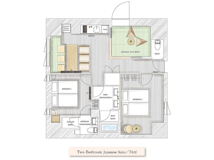 2つのベッドルームと和室を備えたスイートルーム。