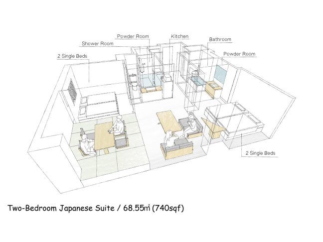 畳を備えた和の趣が漂う、少し広めの2ベッドルームスイート。マスターベッドルームは専用のシャワールーム付き。