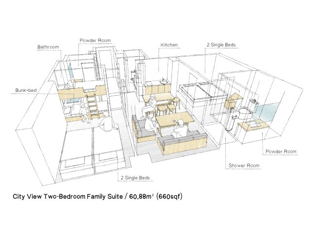 子どもも喜ぶ2段ベッド付き、高層階の2ベッドルームスイート。マスターベッドルームは専用のシャワールーム付き。