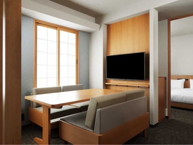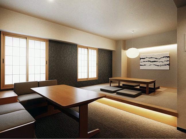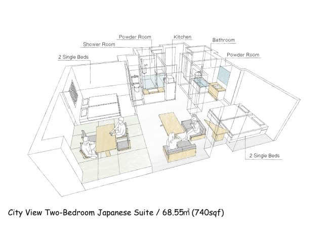 畳を備えた和の趣が漂う、少し広めの高層階2ベッドルームスイート。マスターベッドルームは専用のシャワールーム付き。
