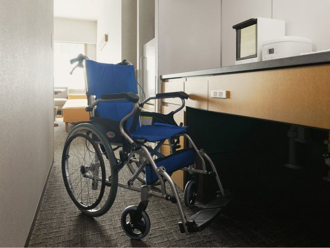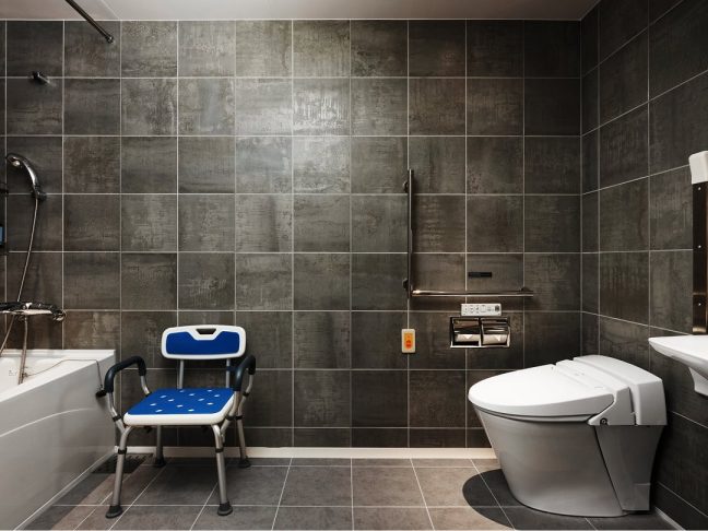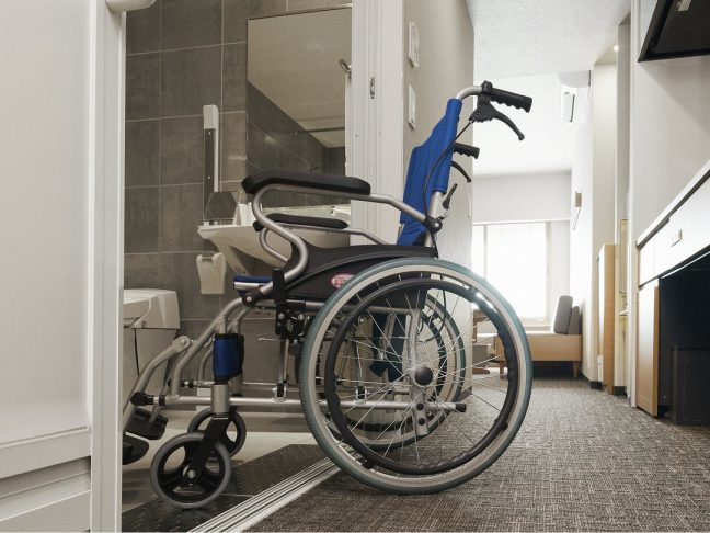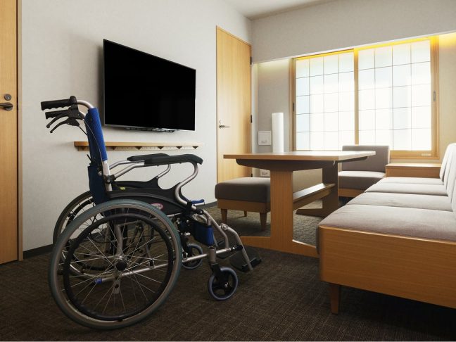 車いすでも安全で快適にお過ごしいただけるよう通路幅を広く、転回スペースも充分に確保した2ベッドルーム。浴室もユニバーサル設計のユニットバスです。