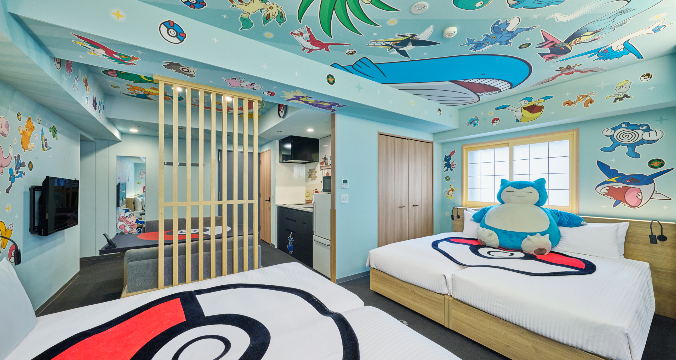 ベッドの上では大きなカビゴンがお出迎え!バンクベッド、布団、ロフトベッドなどさまざまなスタイルをご用意しています。