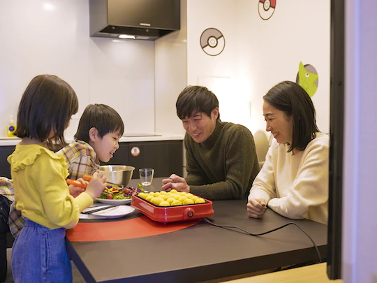 日本忍者協議会監修の「忍者ルーム」は、お部屋に隠れている忍者探しゲームに子どもは大盛り上がり。寿司カウンターを設置した「プレミアムルーム」は、カウンターを使って手巻き寿司を作ったり、料理を盛り付けるなどパーティーを楽しめます。約75㎡の広いお部屋で、8名までお泊まりいただけます。