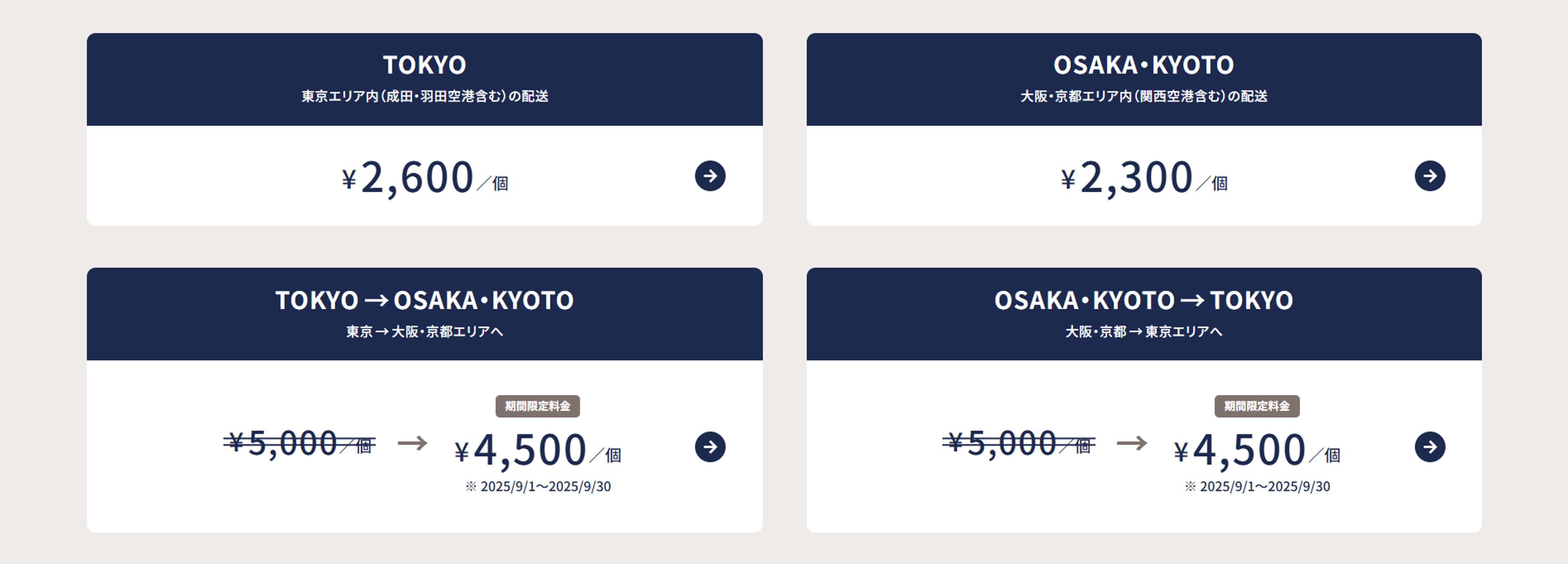 東西間配送スタート記念として、東京⇔大阪・京都エリア間の料金が9月1日~9月30日の期間限定で10%OFF(日本時間での予約受付分)