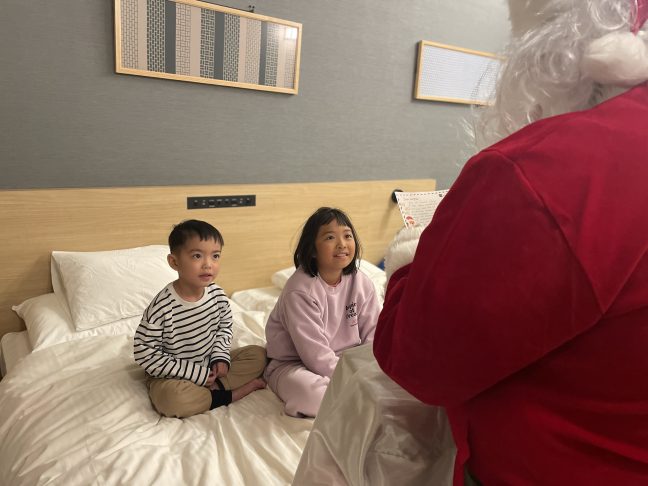 - お部屋にサンタクロースが現れた瞬間、子どもたちの目が輝いたのを見て、私たちも胸がいっぱいになりました。このサプライズは、子どもたちだけでなく、私たちにとっても忘れられない思い出となりました。