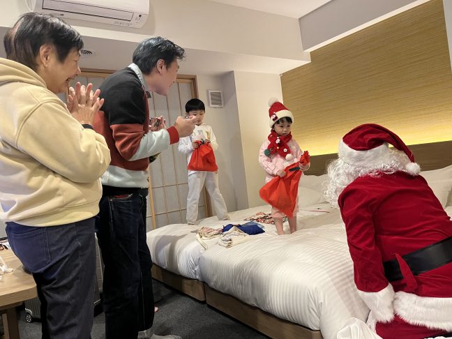 12月24日、滞在中のゲストを対象に、サンタクロースがお部屋を訪れて、事前にお預かりしたプレゼントをお届けするクリスマスサプライズを実施しました。旅行中でも自宅のような温かなクリスマスを楽しんでいただき、子どもたちの夢を叶える特別なひとときを提供しました。また、ロビーにもサンタクロースが登場し、お菓子を配ったり一緒に写真撮影を楽しめるミニイベントも開催。ゲストとともに、笑顔に包まれた特別なクリスマスイブを過ごしました。