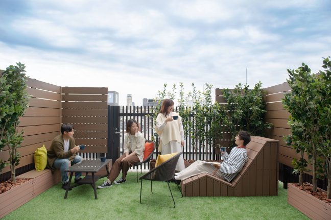 ゲストをお出迎えするフロントは、花札のアートが飾ってあり、毎月変化していく趣向を凝らしています。ロビーフロアには、ボードゲームを楽しめる「遊べる縁側」やフィットネスルーム、ランドリールームを備えています。