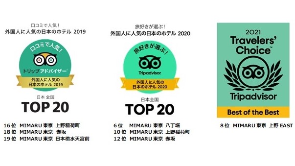 MIMARUでは、世界最大の旅行プラットフォーム「TripAdvisor®」の日本法人であるトリップアドバイザー株式会社が発表した「2021トラベラーズチョイス ベスト・オブ・ザ・ベスト ホテル」において「MIMARU東京 上野EAST」が日本のベストホテル8位に、また、同社が発表した「インバウンドレポート2020」「インバウンドレポート2019」にて「旅好きが選ぶ!外国人に人気の日本のホテル」ランキングTOP20に3施設が選出されました。これらは、世界中から投稿される口コミと評価をもとに、旅行者から最も高い評価を受けた施設を表彰するものです。