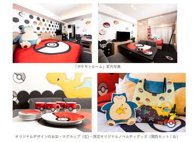 「MIMARU」で提供する「ポケモンルーム」は、ダイニングスペース、ベッドスペースにモンスターボールをデザインモチーフとした壁紙を設え、巨大なカビゴンのぬいぐるみをご用意しています。客室内のキッチンにはオリジナルデザインのお皿・マグカップも備え、ポケモンルームでのご滞在をお楽しみいただけます。また、「ポケモンルーム」宿泊者にはオリジナルノベルティグッズをプレゼント。詳細は特設サイトをご覧ください。