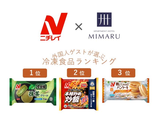 日本ではじめて温めるだけで食べられる調理冷凍食品をつくったニチレイフーズと、宿泊者の9割が海外ゲスト、キッチンを備えた広い客室で家族や仲間と“みんなで泊まる” を楽しむアパートメントホテル「MIMARU」は、外国人ゲストの日本の冷凍食品に対するリアルな声を知りたいというニーズが合致し、共同で試食アンケート調査を行いました。