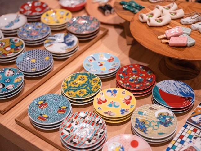 2階のロビーフロアにある「ライフスタイル雑貨」コーナーには、色鮮やかな豆皿や愛らしい箸置き、料理を引き立てる小皿や大皿などが、楽しい蚤の市のように美しく並んでいます。ゲストは、実物を手に取り、お気に入りの食器を客室内にお持ちになり無料でお試しいただけます。お茶・酒器セットや、これからの季節に嬉しい鍋料理用のセットなどもご用意しています。