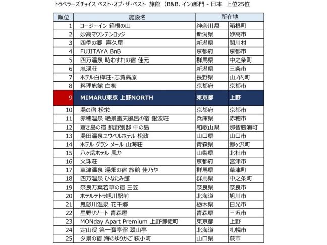 『MIMARU東京 上野NORTH』 旅館(B&B、イン)部門 日本9位に選出