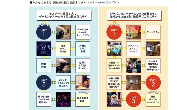 『MIMARU東京 池袋』は、バーチャルでつながるアイテムとしてeスポーツに着目し、日本初となる5人の仲間が一緒に宿泊してプレイできるゲーミングルームのあるホテルとしました。昼夜を通じてゲームに集中できる最高の環境で、ゲーム前後の作戦会議もでき、時差や時間も気にせずに国内外のプレイヤーと白熱した時間を楽しめます。ジャパンカルチャーに関心の高い海外ゲスト、仲間同士や東京に訪れる家族などが「新しい池袋の旅」を楽しみ、新しいカルチャーを生み出すホテルをめざします。今後もMIMARUの開発・運営を通じて、日本やその街の魅力や文化を楽しみ、日本をもっと面白くする観光をお届けしてまいります。