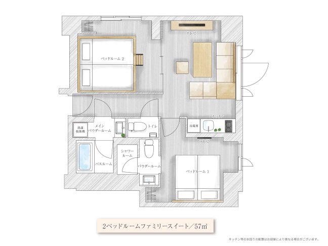 全室リビング・ダイニングに加え、2つ以上のベッドルームで構成されたスイートタイプの客室。みんなで集まるリビング空間と、プライベート空間の双方を備えるため、多人数で同室に泊まる楽しさと、それぞれがくつろぐ時間を大切にできます。