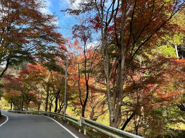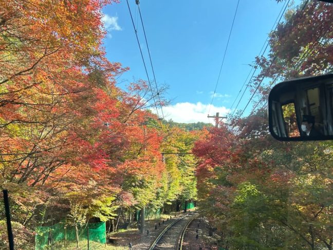 "枫叶虽然没有完全红,却也是色彩缤纷,穿越在枫林之中的时候,火车司机有意放慢速度,可是还是觉得时间太短。下了火车转乘汽车去贵船神社,一边是小溪潺潺,枫树婆娑,一边是笔直参天的松林,好想沿着公路